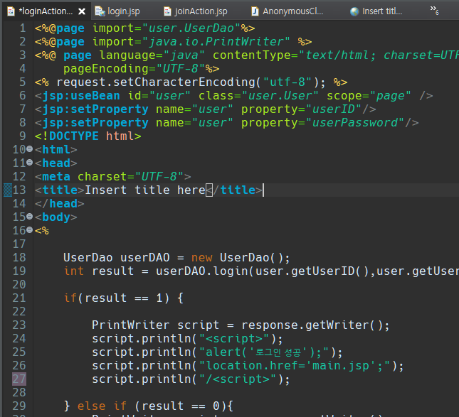 실행시 컴파일 오류가 나지않고 웹 페이지상에서 loginAction.jsp에 멈춰있는걸 보면
