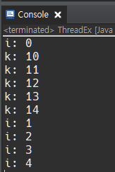 작업결과 : 1번 thread와 2번 thread의 작업이 동시에 무작위로 수행된다.