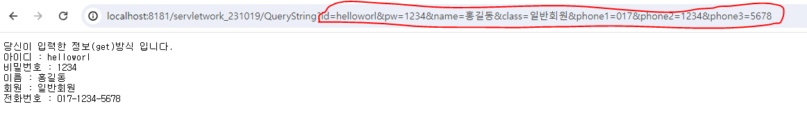 위 서블릿 파일이 실행되며, 다음과 같이 입력한 값을 get방식으로 넘어오게된다.