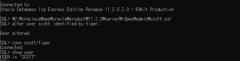 cmd 상에서 @를 붙인뒤 C:\oraclexe\app\oracle\product\11.2.0\server\rdbms\admin의 scott 파일을 끌어놓으면