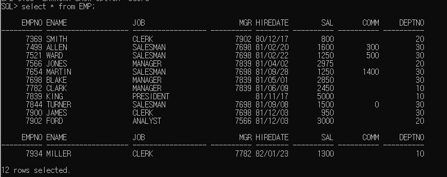 select * from EMP : EMP 테이블내 모든 행열을 조회한다.