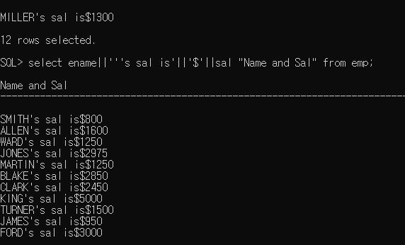 : ename과 job에 해당하는 튜플(행)들을 붙여서 출력한다.