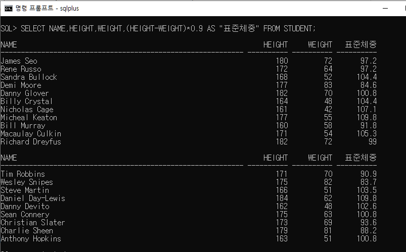 => SQL> SELECT NAME,HEIGHT,WEIGHT,(HEIGHT-WEIGHT)*0.9 AS "표준체중" FROM STUDENT;