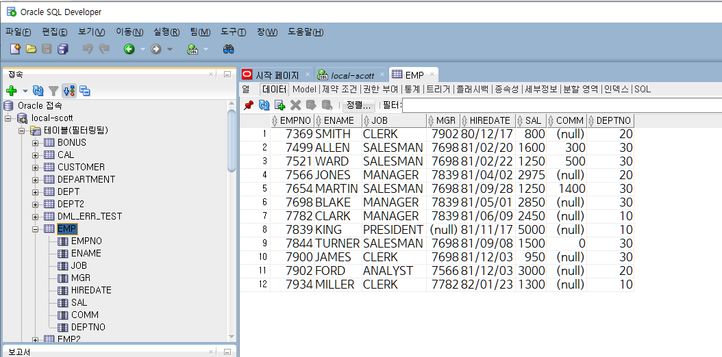 Oracle 홈페이지에서 개발자 다운로드 항목에 SQL Developer를 설치후, 이전에 만들어뒀던 scott 계정으로 데이터베이스를 접속한다.