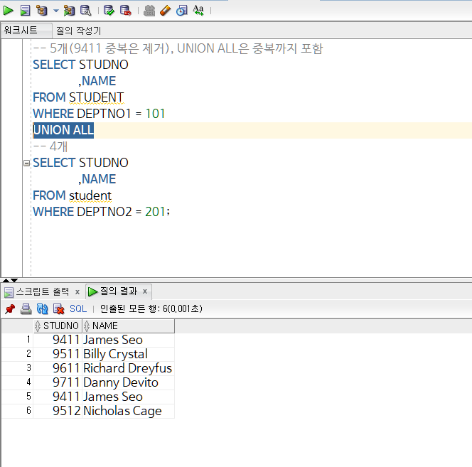 UNION ALL을 사용했기때문에 9411_James Seo가 2번 출력된다.