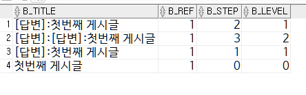 새로운 답변글 값이 ref = 1, step = 1 , level = 1 가 되고, "b_step > ?" 쿼리 조건에 의해 기존의 나머지 댓글들은 step값이 1씩 추가되므로, 다음과 같다.