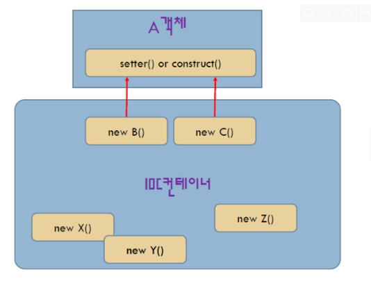 A 객체는 IOC 컨테이너에 존재하는 new 객체들을 주입 받아 사용한다.