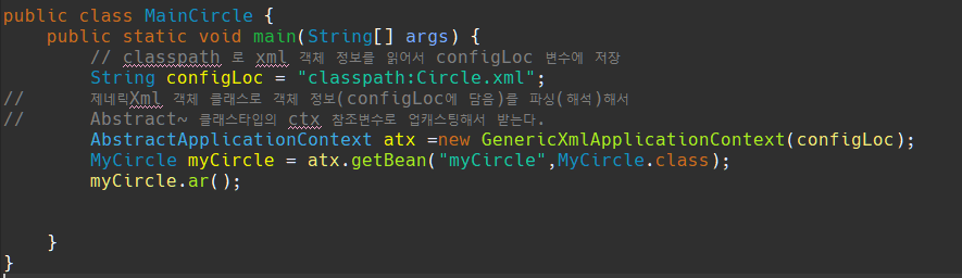 기존 자바에서 사용하던 방식과 달리 메인 메소드에서 객체를 직접 생성하지않고 xml 설정을 통해 Bean에 있는 객체를 주입받아 사용 하고있다.