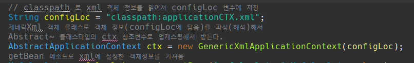 GenericXmlApplicationContext를 통해 원하는 객체들을 xml 파일에 설정하면서 (= 스프링 컨테이너에 내가 사용할 객체들을 담았다) 스프링 컨테이너가 이후 해당 객체들을 제어하고 필요할때 주입하는 방식으로 사용한다.