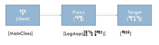 MainClass 에서 특정 기능을 호출하면, LogAop 라는 공통기능의 클래스(Aspect)가 핵심기능 Target에 Jointpoint(메소드)를 적용한다.