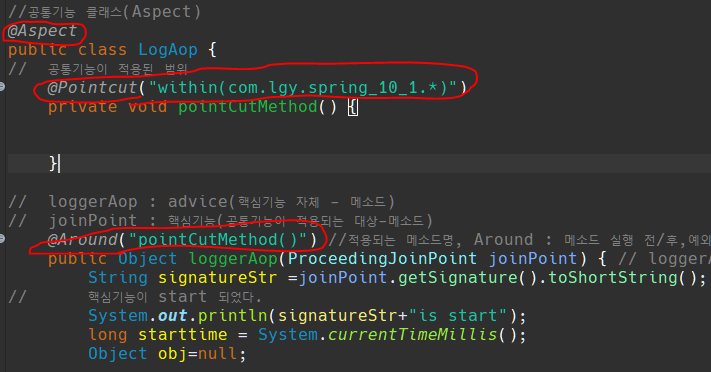 2. LogAop Class(Aspect) 클래스 파일에 해당 기능들에 어노테이션 설정