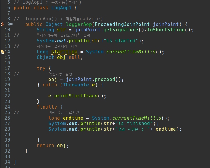 - LogAop1 공통기능(Aspect) 클래스 빈 등록
