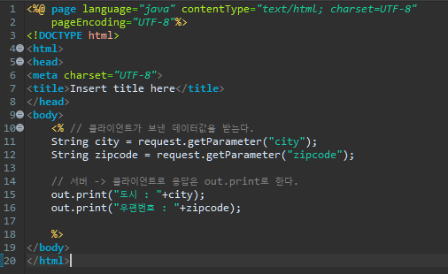 통신내용은 단순히 클라이언트로부터 받은 city와 zipcode를 서버가 "도시 : city 우편번호 : zipcode" 보낸다는것이다.