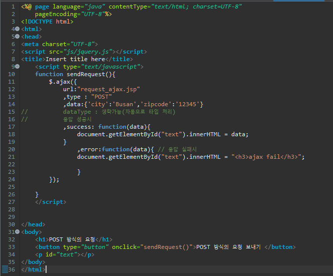 요약하면, request_ajax.jsp로 다음의 data를 POST 방식으로 보내는데, 성공하면 서버에서 받아온 data를 Id=text인 <p>에 넣겠다는 것이다.