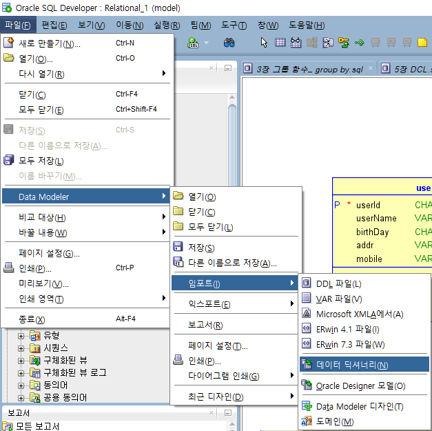 ERD 다이어그램 DDL파일을 sqldeveloper 에서 임포트하여 ERD 다이어그램 불러오기