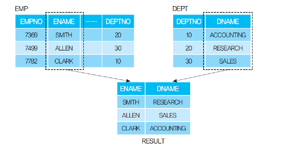 이때, 만약 EMP 테이블에서 사원별 부서명을 조회하고싶다면 = EMP 테이블과 DEPT 테이블을 JOIN 하여 연관된 데이터들을 가져오는 것이다.