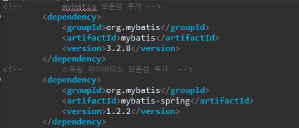 Mybatis를 사용하기위해 pom.xml 디펜던시에 위의 2개의 의존성을 추가해준다.