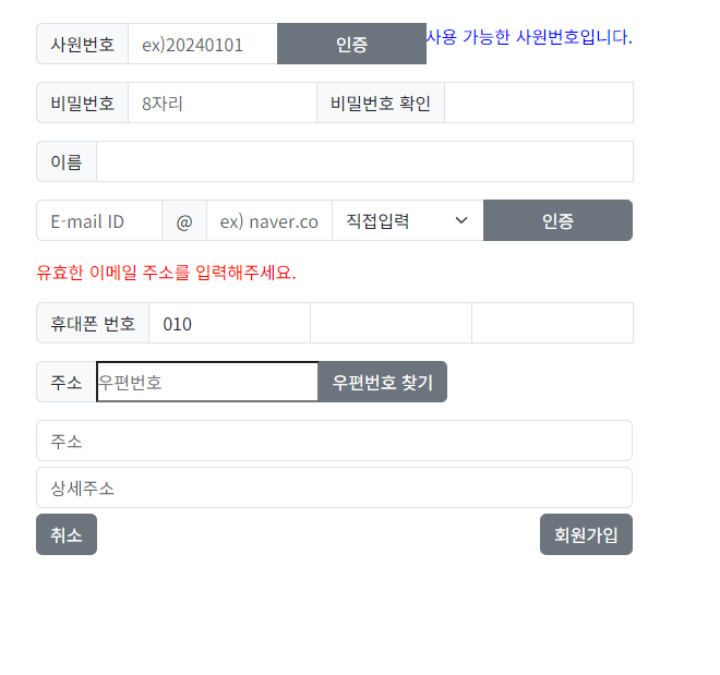 회원가입 페이지에서는 기본적인 항목들의 ajax 통신을 통한 유효성검사와