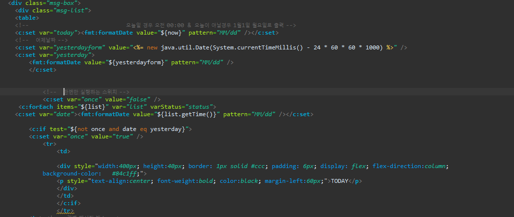 오늘날짜와 같을 경우 어제날짜의 메시지와 처음 생성되는 오늘날짜 메시지 사이에 딱 1번만 <p>TODAY</p>라는 행을 삽입할수있는 로직이 필요하여, boolean타입의 변수를 생성하여 스위치 역할을 할수있도록하였다.
