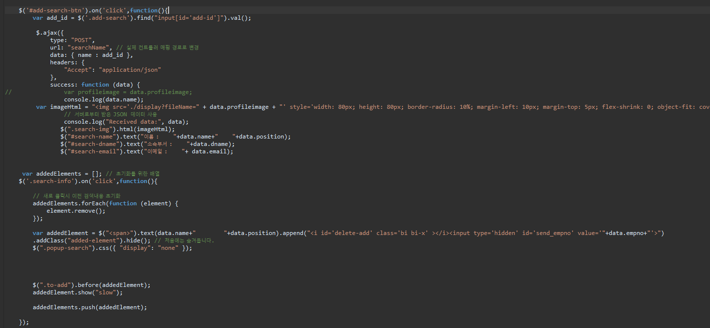클릭이벤트로 선택한 사용자를 받는사람 칸에 추가하는 구문을 append하기위해 받았던 addedElements 문자열 변수를