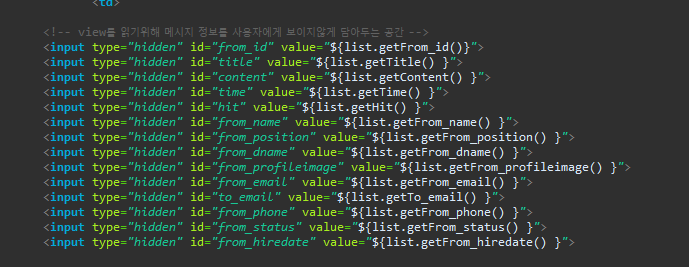 서버에서 받아온 메시지 데이터를 출력하면서, 최대한 페이지 이동을 지양하고자 해당 메시지를 클릭하면 오른쪽에 메시지 세부내용을 볼수있도록 값들을 담을수있는 임시저장공간을 생각하다가, hidden타입의 input에 값을 담아놓고 필요할때마다 꺼내쓸수있도록 하였다.