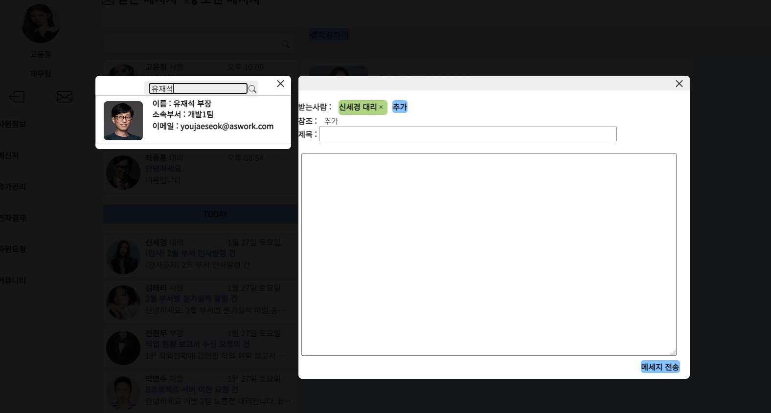 메시지 작성화면에서 추가버튼을 클릭하면, 사원을 검색할수있는 팝업이 나오고 여기서 검색된 사원을 클릭하면