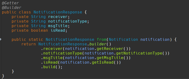 NotificationResponse 클래스는 Notification 객체가 클라이언트에게 전송될때, 클라이언트에게 맞는 형식으로 변환시켜주는 클래스이다.
