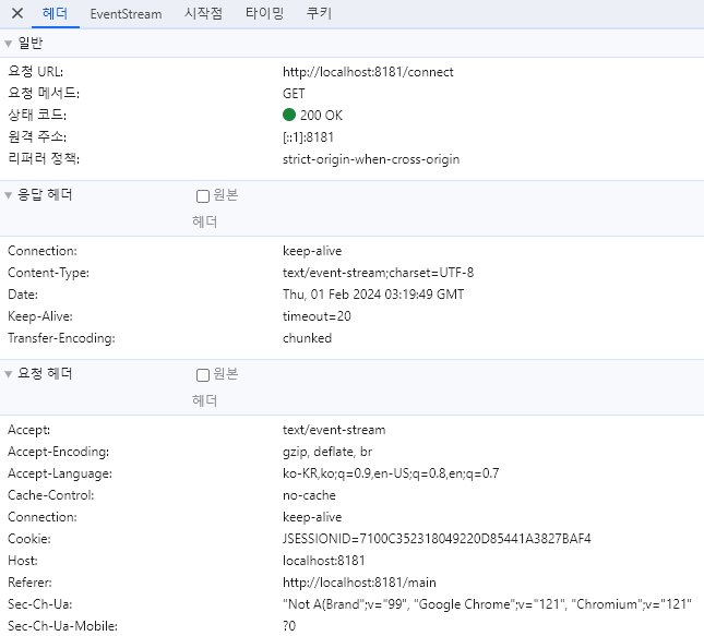 "/connect" 경로로 요청을 보낸다. 해당 경로로 addEventListener()를 통해 이후 서버에서 보내는 데이터들을