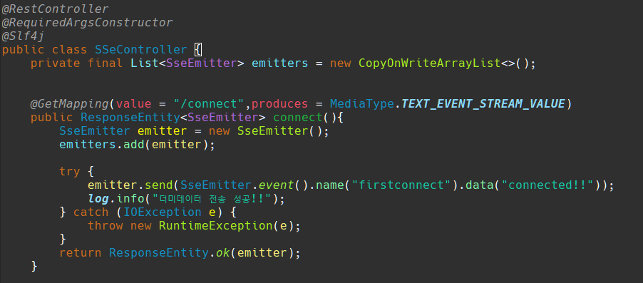 클라이언트에서 보내온 요청을 받는 "/connect" 매핑된 컨트롤러이다. Sse를 사용하기위하여 스프링 프레임워크에서 지원하는 SseEmitter를 사용한다.