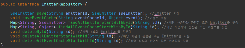 즉, 사용자마다 고유의 id를 가진 Emitter가 있을것이고, 이벤트가 발생하면 해당 사용자의 Emitter의 cache값인 event를 전송하기때문에, 서버는 Emitter를 보관해야한다.