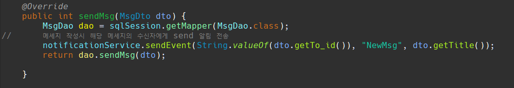 나의 경우 메시지 작성시, DB에 메시지 정보를 저장한뒤, SendEvent() 메소드를 호출하여 메시지 관련 정보를 파라미터로 넣어주었다.