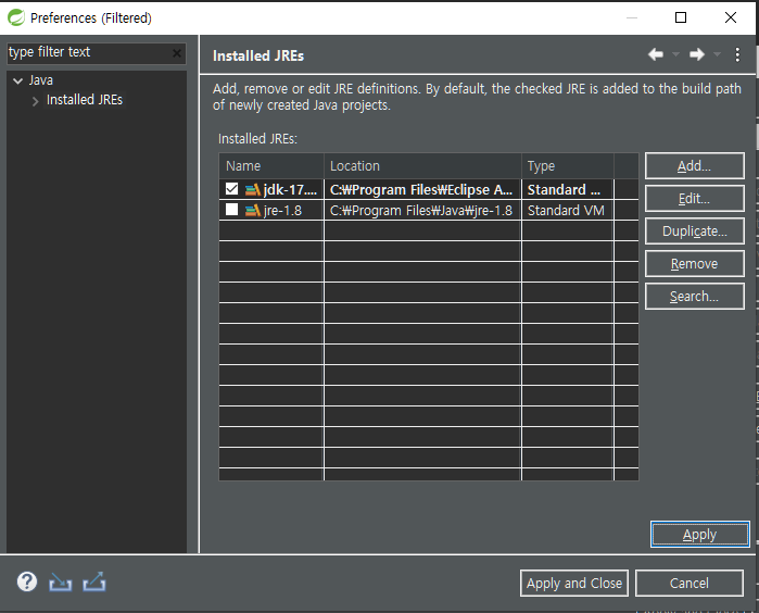 스프링 부트를 사용하기위해 기존에 사용하던 JDK 1.8 Version에서 JDK 17로 버전을 변경해준다.