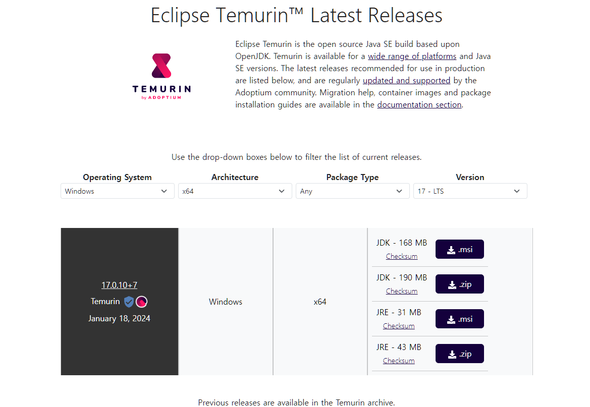 Adoptium에서 제공하는 OpenJDK 17 version을 설치하면, 따로 환경변수 설정을 해주지않아도 자동으로 java 17 version으로 설정이 완료된다.