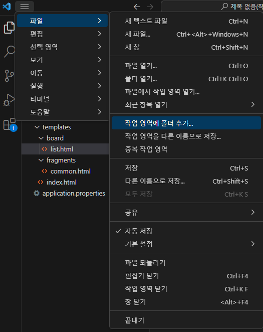 먼저, Thymeleaf html 파일들이 위치한 프로젝트의 resources 경로를 VSCode의 작업폴더로 설정한다.