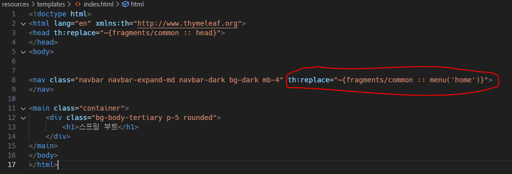 그리고, 공통영역을 삽입하고싶은 html에 다음의 < th:replace="~{해당 fragment의 경로 :: fragment명}> 를 입력해주면