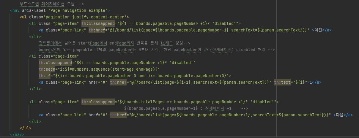 부트스트랩의 pagination 모듈을 사용해서 페이징 버튼을 구현해서 서버에서 보내준 boards의 pageable 객체의 페이징 관련 변수를 활용해서 버튼을 생성해주면 된다.
