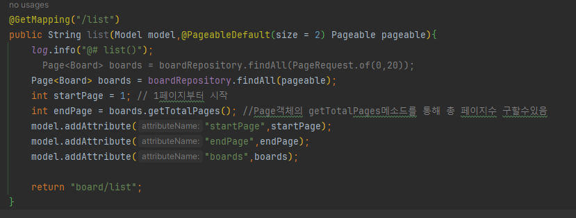 게시물 리스트를 출력하는 list 컨트롤러에서, 파라미터로 Pageable 객체를 받아준뒤,