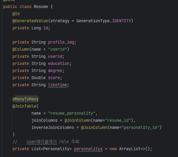Resume와 Personality를 중간에서 받는 Resume_Personality는 Entity로 구현되지않고 ManyToMany 어노테이션을 통해 매핑시켜, 해당 컬럼을 조인해서 각 Entity에 받아오기때문에 클라이언트로 직렬화를 하여 보내면서 순환 참조가 발생한다는 것이 주요 원인으로, JPA에서 다대다 관계 테이블을 직렬화 할경우 자주 발생하는 문제라고한다..