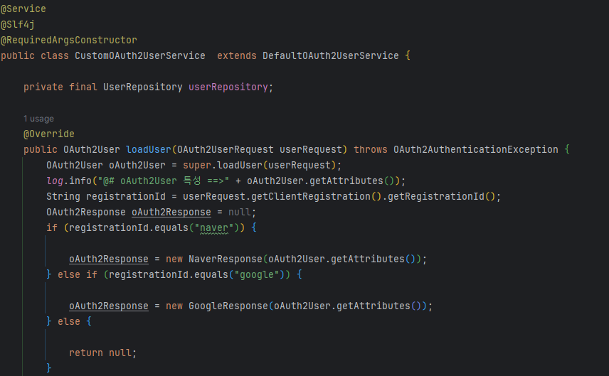 나의 경우에는 기존에 자체로그인을 구현한뒤 소셜로그인 기능을 추가한터라 기존에 구현된 자체로그인 항목과 부가기능들이 너무 방대해져 해당 로직내에서 OAuth2User 객체를 직접 세팅해주었다.