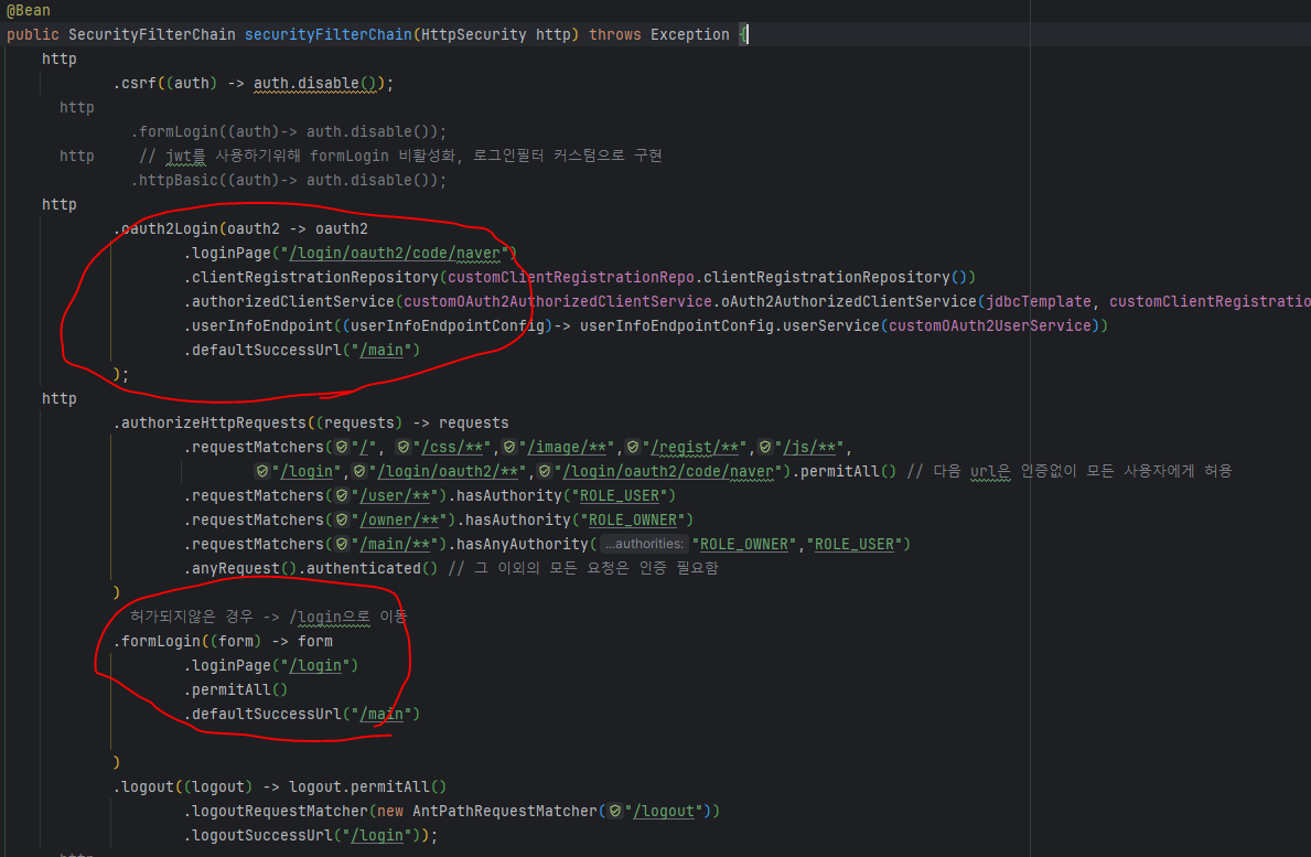 Security FilterChain에서 formlogin방식도 같이 사용하기위해 로그인 접근 url을 소셜로그인과 자체로그인 2가지로 나누었다.