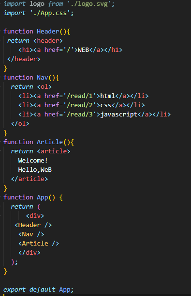 컴포넌트들을 함수의 형태로 작성하고, App() 함수안에서 해당 컴포넌트를 삽입해주면서 Html 파일을 렌더링 하는 형태이다.