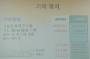고유한 물리 주소를 가진 셀(cell)들을 모아 놓은것. 주소와 내용 모두 이진수로 표현.