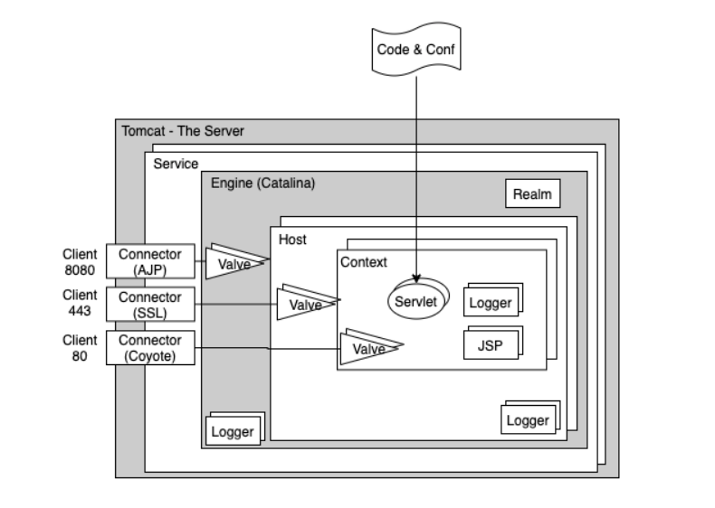 - The Server : 서버는 우리가 실행하는 톰캣 그 자체로 JVM위에서 하나의 Process로 실행되는 하나의 인스턴스이다. 즉, 톰캣을 실행한다는것은 하나의 위 아키텍처 구조가 실행된다고 볼수있다.