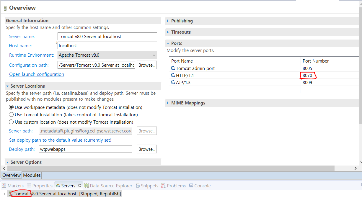 하단 콘솔창부분에서 Servers를 더블클릭하면 위처럼 전반적인 Server 설정을 할수있는데, Ports에서 HTTP/1.1 요청을 받는 포트를 8070으로 변경해주었다.