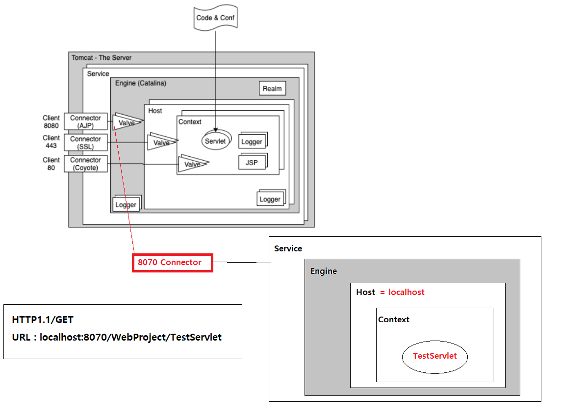 - Connector : TCP Port에서 클라이언트가 보낸 요청을 listen하여 연결된 Engine으로 보내준다.