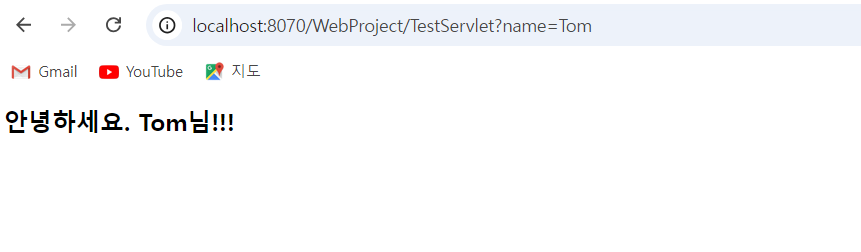 localhost:8070/WebProject/TestServlet?name=Tom 요청을 보내고, 해당 서블릿이 동작하여