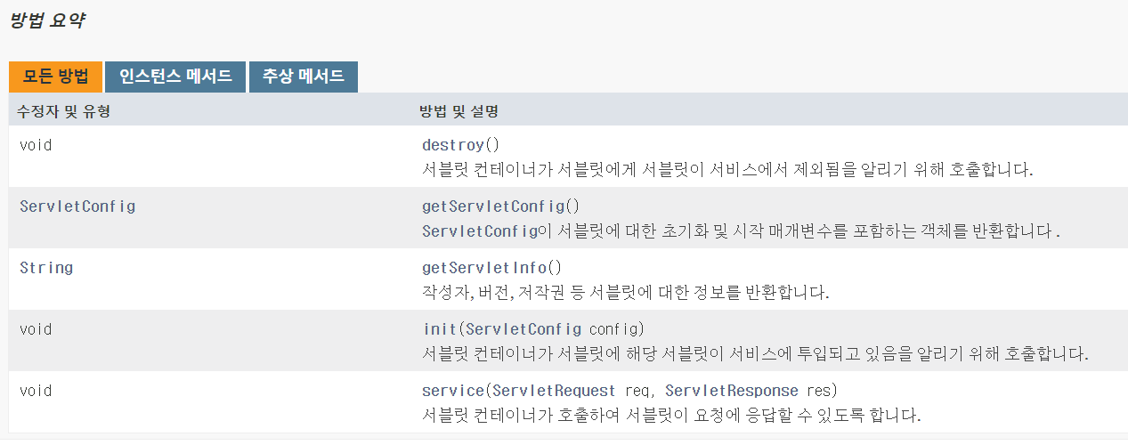 우선, 가장 최상위 인터페이스인 Servlet의 공식문서를 살펴보면, 아래와 같은 메소드를 가지고있다.