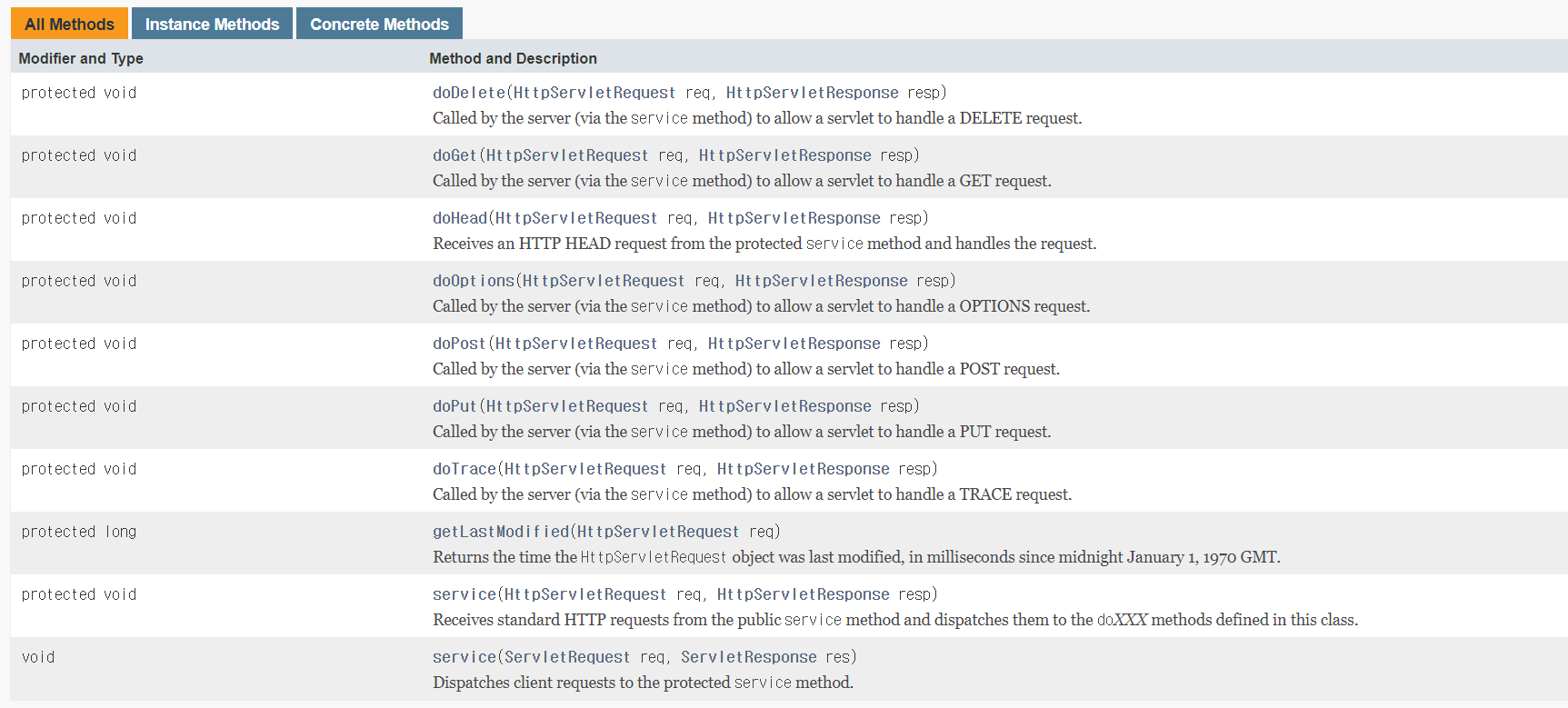그러나 HttpServlet는 HTTP 프로토콜에 특화된 서블릿 구현체로 doGet,doPost등 HTTP 메소드에 따른 다양한 요청을 처리할수있는 기능을 제공한다.